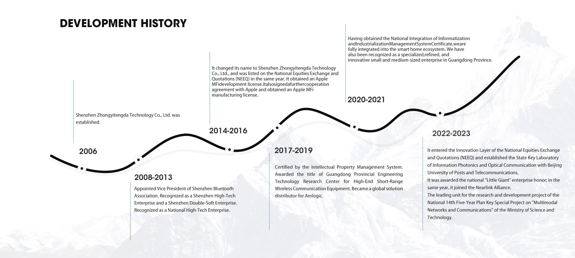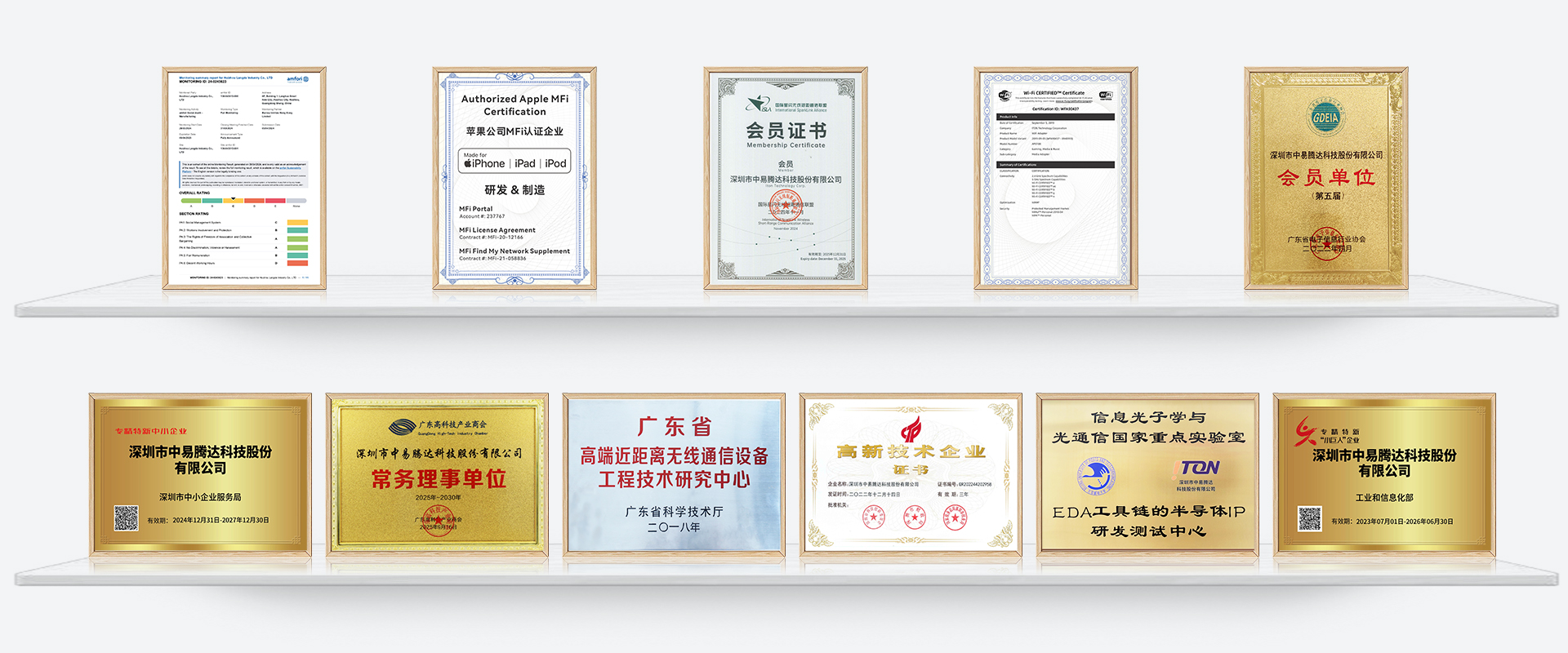 Founded in 2006 and listed on the National Equities Exchange and Quotations (NEEQ) in 2014 (Stock Code: 830982), Zhongyi Tengda is a national-level “Little Giant” enterprise, a National High-Tech Enterprise, and a Guangdong “Specialized, Refined, Differential, and Innovative” Enterprise. We also operate the “Guangdong Engineering Technology Research Center for High-End Short-Range Wireless Communication Devices.”